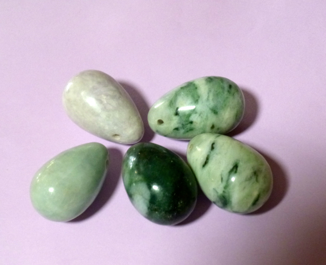 O principal material para os Ovos Yoni é o Jade, apesar de haver outras pedras semi-preciosas que também podem ser usadas para Ovos Yoni. O Jade é uma pedra dura, suave e não-porosa e, como tal, é muito resistente. Também possui uma condutividade térmica elevada, o que significa que fica quente rapidamente quando em contacto com o corpo, atingindo uma temperatura agradável em apenas alguns segundos.